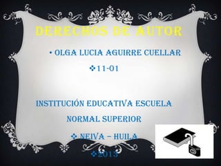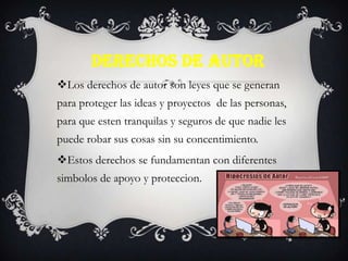 Los derechos de autor son leyes que protegen las ideas y proyectos personales, garantizando que nadie pueda utilizarlos sin consentimiento. Estos derechos incluyen diferentes símbolos que indican el nivel de protección y uso permitido, incluyendo usos educativos y condiciones para hacer copias. El documento también aborda el plagio y las excepciones a los derechos de autor, incluyendo derechos morales y patrimoniales.
