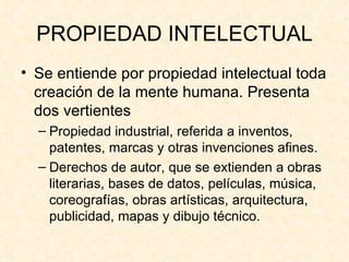 El documento trata sobre los derechos de autor y la propiedad intelectual. Explica que los derechos de autor protegen las obras literarias, artísticas y científicas y pertenecen al creador de por vida más 70 años después de su muerte. También cubre los tipos de derechos (morales y patrimoniales) y las entidades de gestión que representan a los creadores para la explotación comercial de sus obras. Finalmente, critica los posibles abusos en la recaudación de derechos por parte de algunas entidades