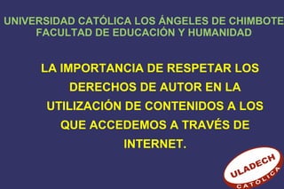 El documento habla sobre la importancia de respetar los derechos de autor en el uso de contenidos en Internet. Explica que desde el origen del mundo digital y el Internet se ha generado con mayor frecuencia la violación de los derechos de autor al descargar contenidos sin costo. Define los derechos de autor y explica que estos incluyen derechos morales como la paternidad y la integridad de la obra, así como derechos patrimoniales como la reproducción y distribución que son limitados en el tiempo.