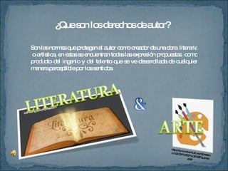 El documento habla sobre los derechos de autor. Explica que los derechos de autor protegen a los autores de obras literarias y artísticas y nacen desde el momento de la creación de la obra. También describe los derechos morales y patrimoniales, así como las limitaciones y excepciones a los derechos de autor. Además, indica que la duración de la protección de los derechos patrimoniales es la vida del autor más 80 años y que los derechos conexos protegen a autores de discos, casetes y radiodifus
