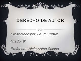 El documento explica el derecho de autor, incluyendo que surge con la creación de una obra y protege los derechos morales y patrimoniales del creador. Define al autor como la persona que crea la obra y describe los diferentes tipos de derechos de autor como los derechos patrimoniales, morales y conexos. También cubre cómo se regula el derecho de autor a nivel internacional y nacional a través de tratados y organizaciones como la OMPI.