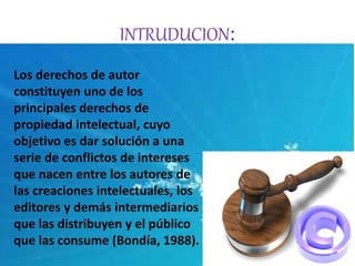Este documento habla sobre los derechos de autor. Explica que los derechos de autor protegen las creaciones intelectuales de los autores y surgen con la creación de una obra. Los derechos de autor tienen una doble naturaleza, moral y patrimonial, y protegen todo tipo de obras originales expresadas en cualquier medio tangible o intangible. Las obras deben registrarse para reforzar los derechos frente a plagios, aunque los derechos surgen con la creación.