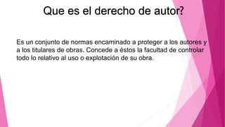 El documento explica que el derecho de autor es un conjunto de normas que protege a los autores y titulares de obras al otorgarles el control sobre el uso y explotación de sus creaciones. Protege todo tipo de obras literarias y artísticas independientemente de su forma de expresión. Sus características son que surge de la creación personal y otorga derechos morales y patrimoniales a los autores.