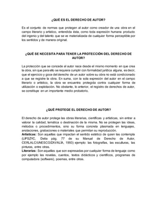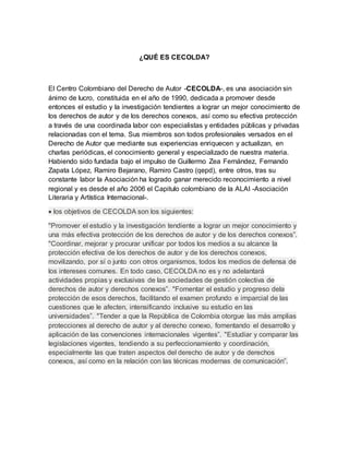 El documento define el derecho de autor como las normas que protegen al creador de una obra original en los campos literario y artístico. Explica que la protección del derecho de autor nace con la creación de la obra y no requiere registro, pero que el registro sirve como prueba. Además, detalla que CECOLDA es una asociación sin ánimo de lucro dedicada a promover el estudio y protección efectiva de los derechos de autor y derechos conexos en Colombia.