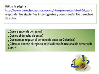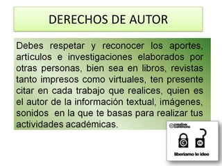 Los derechos de autor protegen las obras creativas de los autores al requerir el permiso para copiar o distribuir su trabajo. El documento proporciona enlaces a sitios web que explican los derechos de autor y cómo evitar el plagio.