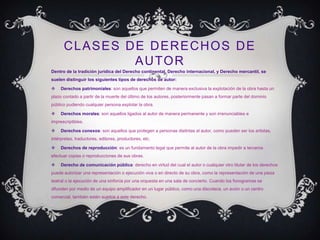 El derecho de autor es un conjunto de normas que regulan los derechos morales y patrimoniales que la ley concede a los autores por la creación de obras literarias, artísticas, científicas o didácticas. Dentro del derecho de autor se distinguen los derechos patrimoniales, que permiten la explotación de la obra por un plazo, los derechos morales ligados de forma permanente al autor, y los derechos conexos que protegen a otras personas relacionadas con la obra.
