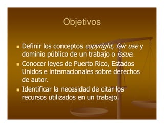 Este documento define los conceptos de derechos de autor, uso justo y dominio público. Explica que los derechos de autor protegen obras originales como literatura, música, películas y más. Los derechos de autor otorgan al autor control sobre la reproducción, distribución y creación de obras derivadas de su trabajo. También cubre leyes de derechos de autor de Puerto Rico, Estados Unidos e internacionales.