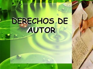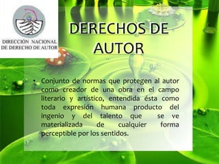 Este documento trata sobre los derechos de autor. Explica que los derechos de autor protegen al creador de una obra literaria, artística o científica. Cubre los tipos de obras protegidas, los derechos morales y patrimoniales del autor, y presenta a CECOLDA, una organización colombiana dedicada a promover el estudio y protección de los derechos de autor. También resume las opiniones del director de la unidad de derechos de autor de Colombia sobre temas como la legislación y avances tecnológicos.