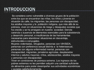 Este documento trata sobre los derechos de grupos vulnerables en la sociedad como niños, personas con discapacidad, mujeres, adultos mayores y pueblos indígenas. Explica que todos los seres humanos nacen libres e iguales y merecen los mismos derechos independientemente de su género, edad, capacidad o etnia. También destaca la obligación del estado de proteger a estas poblaciones vulnerables y garantizar sus derechos fundamentales como la vida, la seguridad, la no discriminación y el desarrollo cultural.