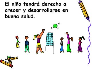 El documento describe los derechos fundamentales de los niños y niñas, incluyendo el derecho a crecer sanamente, a recibir educación gratuita y obligatoria, y a ser tratados con amor y comprensión para apoyar su desarrollo, así como el derecho a un nombre y nacionalidad desde el nacimiento y a no ser discriminados por su sexo, nacionalidad, raza, religión u otro factor.