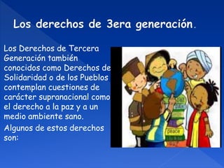 Los Derechos de Tercera Generación, también conocidos como Derechos de Solidaridad o de los Pueblos, incluyen el derecho a la paz, un medio ambiente sano y la autodeterminación. Surgen después de la Segunda Guerra Mundial para abordar cuestiones supranacionales y se reconocen formalmente en declaraciones como la del derecho al desarrollo en 1986.
