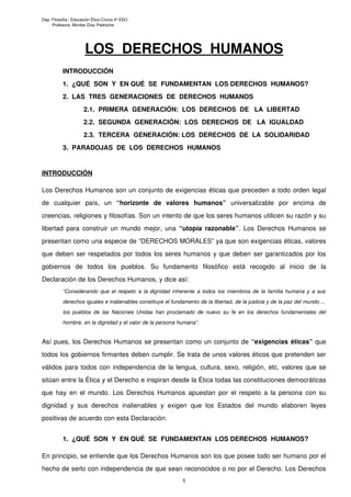 Este documento presenta una introducción a los derechos humanos. Explica que los derechos humanos son exigencias éticas universales que se fundamentan en la dignidad inherente a todos los seres humanos. Describe las tres generaciones de derechos humanos: los derechos civiles y políticos como la libertad de expresión (1a generación), los derechos económicos, sociales y culturales como la educación y la salud (2a generación), y los derechos de solidaridad como el medio ambiente (3a generación). Finalmente, señ
