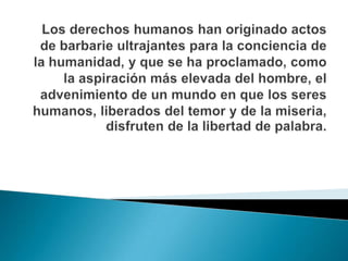 El documento destaca la importancia de los derechos humanos para todos los pueblos y naciones. Establece que todos los seres humanos nacen libres e iguales y deben comportarse fraternalmente. Además, prohíbe la esclavitud y la servidumbre en todas sus formas.