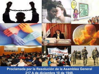 La Declaración Universal de Derechos Humanos, proclamada el 10 de diciembre de 1948, establece que todos los seres humanos nacen libres e iguales en dignidad y derechos. Esta declaración incluye derechos fundamentales como el derecho a la vida, la libertad, la seguridad, y la protección contra discriminación, tortura y detención arbitraria, entre otros. Además, promueve derechos sociales, económicos y culturales, así como la responsabilidad individual y colectiva en el respeto a estos derechos.