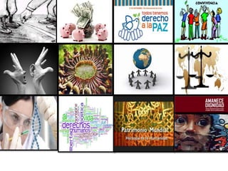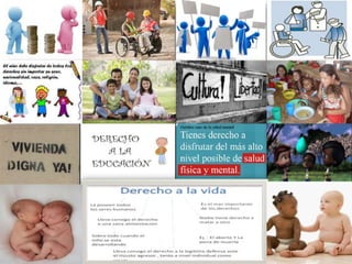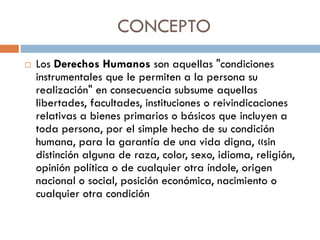 Este documento define los derechos humanos y describe sus características y tipos. Explica que los derechos humanos son aquellas condiciones esenciales para que las personas puedan vivir con dignidad, e incluyen derechos civiles y políticos, derechos económicos, sociales y culturales, y derechos de los pueblos. También describe los derechos políticos como aquellos que permiten la participación ciudadana en la vida política del estado, así como los derechos económicos, sociales y culturales relacionados