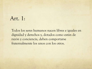 Este documento presenta la Declaración Universal de los Derechos Humanos y enumera 30 artículos que describen los derechos fundamentales que toda persona debería gozar como ser humano, como el derecho a la vida, la libertad, la igualdad, la propiedad privada, la seguridad social, la educación, el trabajo, la salud y la vivienda. El documento establece que todos los seres humanos nacen libres e iguales y que los Estados deben proteger y garantizar estos derechos fundamentales para todos.