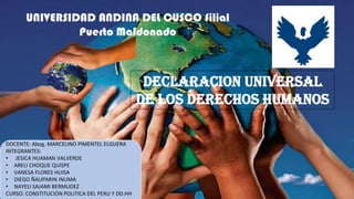 Este documento presenta un resumen de una clase sobre la Declaración Universal de los Derechos Humanos impartida por el abogado Marcelino Pimentel en la Universidad Andina del Cusco, filial Puerto Maldonado. La clase contó con la participación de 5 estudiantes y abordó los artículos 13 al 18 de la Declaración, los cuales tratan sobre el derecho a la libertad de movimiento, el derecho al asilo, el derecho a la nacionalidad, el derecho al matrimonio y a fundar una familia, el derecho a la propiedad