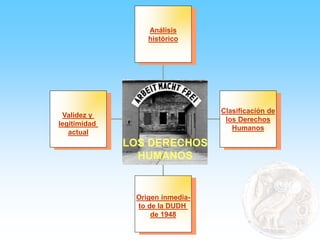 Este documento presenta un análisis histórico de los derechos humanos en cuatro secciones. La primera sección describe declaraciones anteriores de derechos humanos. La segunda sección analiza los precedentes históricos como las revoluciones liberales y la lucha obrera. La tercera sección examina los antecedentes inmediatos como la Segunda Guerra Mundial. La cuarta sección clasifica los derechos humanos en derechos de primera y segunda generación. El documento también resume la Declaración Universal de Derechos Humanos de 1948.