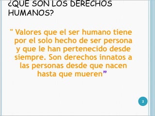Los derechos humanos son valores inherentes a todas las personas por el solo hecho de ser humanos, como establecen la Constitución y declaraciones internacionales. Son universales, inviolables y complementarios, y buscan garantizar el bienestar de todas las personas sin distinción. Corresponde al Estado, particulares y organismos internacionales respetarlos.