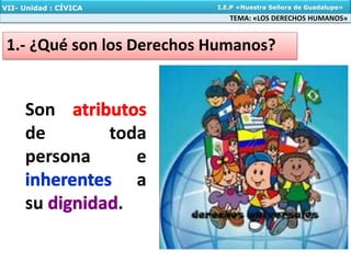 El documento describe los derechos humanos. Explica que todos los seres humanos poseen los mismos derechos desde su concepción y que estos derechos protegen la integridad física, económica, social y cultural. Además, clasifica los derechos humanos en tres generaciones: derechos de primera generación relacionados a la vida, igualdad e integridad personal; derechos de segunda generación relacionados al trabajo y seguridad social; y derechos de tercera generación relacionados al medio ambiente y orden social.