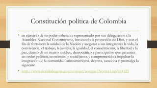 El documento presenta información sobre los derechos humanos en Colombia. Explica que la Constitución Política de Colombia de 1991 estableció un Estado social de derecho, democrático y participativo para garantizar la justicia, igualdad y libertad. También describe algunas instituciones colombianas clave relacionadas con los derechos humanos como la Defensoría del Pueblo, las Personerías Municipales y la Comisión Interamericana de Derechos Humanos.