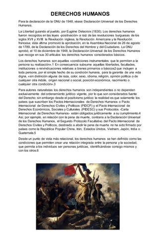 La Declaración Universal de los Derechos Humanos de 1948 estableció los derechos humanos fundamentales. Los derechos humanos se originaron en las revoluciones burguesas de los siglos XVII y XVIII y se codificaron en documentos como la Declaración Francesa de los Derechos del Hombre y del Ciudadano de 1789. La ONU aprobó la Declaración Universal de los Derechos Humanos en 1948, que enumera 30 derechos básicos aplicables a todas las personas. Existe un debate sobre si los derechos humanos son universales o dependen