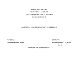 Este documento resume los diferentes tipos de derechos reconocidos en la constitución venezolana como los derechos humanos, civiles, políticos, sociales, de la familia, culturales y educativos, económicos, de los pueblos indígenas y ambientales. También describe los deberes que incluyen honrar la patria, cumplir las leyes, participar cívicamente, pagar impuestos, prestar servicio militar o civil, y prestar servicio comunitario para ejercer una profesión.