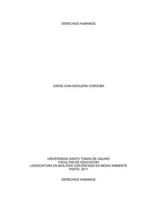 Este documento trata sobre los derechos humanos y su relación con el medio ambiente. Presenta un proyecto de aula para explicar estas relaciones a estudiantes de quinto grado en un colegio de Colombia. Incluye secciones sobre la justificación, objetivos, marco teórico sobre derechos colectivos y ambientales, y actividades planeadas como powerpoints, foros y concursos de dibujo para educar a los estudiantes sobre estos temas.