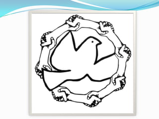El documento promueve los derechos humanos, la libertad, la paz y la no discriminación a través de frases cortas y una referencia a un cuadro de Eugène Delacroix que representa estos ideales. También hace un llamado a curar al mundo y a permanecer unidos.