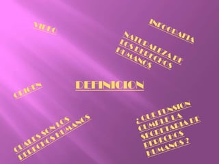 El documento define los derechos humanos como derechos inherentes a todos los seres humanos sin distinción. Explica que los derechos humanos se originaron para combatir el fascismo y el nazismo durante la Segunda Guerra Mundial y fueron establecidos formalmente en la Declaración Universal de los Derechos Humanos de 1948. Luego enumera algunos derechos humanos fundamentales como el derecho a la vida, la libertad, la igualdad y la justicia, y describe la función de la Secretaría de Derechos Humanos de promover y proteger los derech