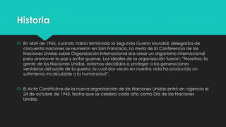 El documento resume la historia y características de los Derechos Humanos. Explica que las Naciones Unidas se crearon en 1945 para promover la paz y prevenir guerras. En 1948, la ONU adoptó la Declaración Universal de los Derechos Humanos para proteger los derechos de todas las personas sin distinción. Los Derechos Humanos son condiciones esenciales para el desarrollo humano y deben respetarse de forma universal, indivisible, inviolable y obligatoria.