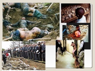 Este documento presenta información sobre derechos humanos, derecho internacional humanitario y la responsabilidad de proteger. Explica las diferencias entre derechos humanos y derecho internacional humanitario, e incluye ejemplos de crímenes de guerra y genocidio juzgados por tribunales internacionales como el de Ruanda y Yugoslavia. También describe el principio de la responsabilidad de proteger aprobado por la ONU, el cual establece que los estados son responsables de proteger a su población de crímenes como genocidio