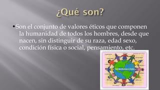 El documento detalla los derechos y libertades fundamentales que todo ser humano posee, sin distinción de raza, sexo, o condición social, incluyendo derechos a la vida, libertad, trabajo, educación y protección contra la discriminación. Subraya la importancia de la educación, destacando que debe ser gratuita y obligatoria en sus niveles elementales, y que su acceso debe ser igual para todos. También pone de relieve cómo la falta de recursos en el tercer mundo limita el desarrollo de estos derechos, profundizando las diferencias sociales.