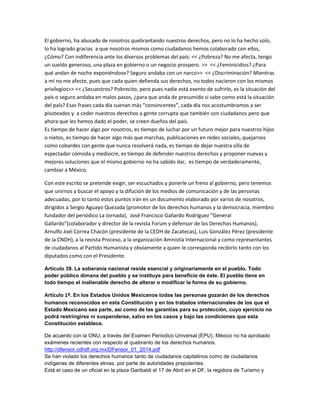 El documento expone varios casos de violaciones a los derechos humanos cometidos por autoridades en México contra ciudadanos y grupos indígenas. Señala la indiferencia de la sociedad ante estos problemas y la necesidad de que los ciudadanos se unan para exigir sus derechos. Propone dirigir un documento a varias organizaciones de derechos humanos para denunciar las violaciones y pedir que se escuche a los ciudadanos.