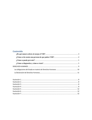 El documento habla sobre los derechos humanos y el VIH-SIDA. Explica cómo el VIH afecta al cuerpo destruyendo células CD4 y debilitando el sistema inmunológico, lo que puede causar enfermedades como la tuberculosis. También describe cómo se transmite el VIH, los síntomas, formas de diagnóstico y tratamiento. Además, discute los derechos humanos de las personas que viven con VIH-SIDA y las obligaciones del estado de proteger esos derechos.