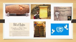 El documento analiza la evolución y la importancia de los derechos humanos, comenzando desde el cilindro de Ciro el Grande en 539 a.C. hasta la Declaración Universal de los Derechos Humanos de 1948. Se destacan hitos clave como la Carta Magna, la Constitución de EE.UU. y la Declaración de los Derechos del Hombre y del Ciudadano en Francia, los cuales han sentado las bases para la protección de los derechos fundamentales a nivel global. Además, se enumera las características esenciales de los derechos humanos y la obligación de los estados de respetarlos, protegerlos y cumplirlos.