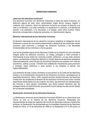 El documento habla sobre los derechos humanos. Explica que los derechos humanos son inherentes a todos los seres humanos sin distinción y enumera algunos derechos como el derecho a la vida y la libertad. También describe el derecho internacional de los derechos humanos y algunos de los tratados y convenciones clave sobre derechos humanos adoptados por las Naciones Unidas, como la Declaración Universal de los Derechos Humanos de 1948. Finalmente, resume los 30 artículos de la Declaración Universal de los Derechos Humanos.