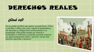 El documento resume conceptos clave del derecho romano como derechos reales, posesión y propiedad. Explica que los derechos reales son poderes jurídicos sobre cosas y tienen tres elementos: sujeto, objeto y causa. Define posesión como el control físico de una cosa con intención de retenerla, y distingue entre posesión justa e injusta. Finalmente, define la propiedad como el poder más amplio sobre un bien y reconoce dos tipos en derecho romano: propiedad quiritaria y bonitaria.