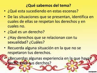 Este documento trata sobre los derechos sexuales y reproductivos. Explica que estos derechos buscan proteger la dignidad humana y promover la justicia, igualdad, libertad y vida. Los derechos sexuales establecen que todas las personas pueden ejercer su sexualidad libremente sin discriminación. Los derechos reproductivos protegen la libertad de decidir sobre tener hijos. El documento también discute cómo proteger estos derechos a través del respeto mutuo y la educación, y las consecuencias del abuso sexual.