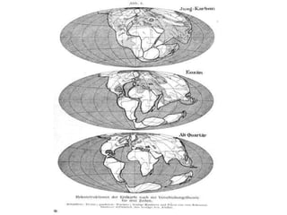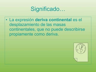 Este documento describe la teoría de la deriva continental y cómo ha evolucionado. Explica que originalmente se refería al desplazamiento de las masas continentales, pero ahora se entiende a través de la teoría de placas tectónicas. También discute cómo la posición de los continentes afecta el clima global a largo plazo debido a los lentos movimientos de deriva a lo largo de millones de años.