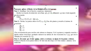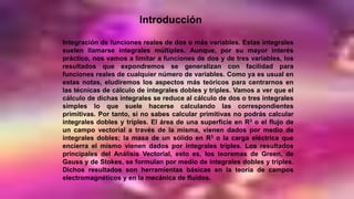 Este documento introduce conceptos sobre el cálculo de integrales de funciones de varias variables. Explica cómo calcular integrales dobles y triples, las cuales son útiles para calcular áreas, volúmenes, cargas eléctricas y flujos de campos vectoriales. También cubre temas como derivadas parciales, derivación implícita, y el uso de multiplicadores de Lagrange para problemas de optimización con restricciones.