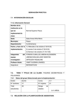 Este documento presenta la planificación de una clase de matemáticas sobre figuras geométricas y polígonos para estudiantes de quinto grado. La clase se implementará en la Normal Superior Pasca en Pasca, Cundinamarca. La clase utilizará el juego tangram y guías de trabajo para que los estudiantes exploren y clasifiquen figuras geométricas. El documento describe los objetivos, materiales, actividades y evaluación de la clase.
