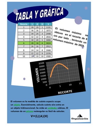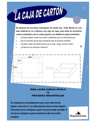El documento describe cómo fabricar una caja sin tapa a partir de un rectángulo de cartón de 40x30 cm recortando cuadrados en cada esquina. Al recortar cuadrados de 6 cm de lado, se obtiene una caja de dimensión máxima 32x24x6 cm, con un volumen máximo de 3,024 cm3.