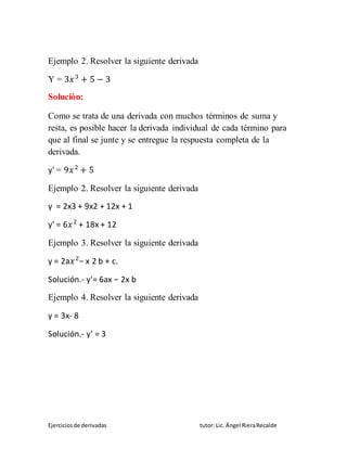 El documento explica conceptos básicos sobre derivadas, incluyendo su significado como la razón de cambio de una función con respecto a su variable, y su definición como la pendiente de la recta tangente a la gráfica de la función. Luego, presenta ejemplos resueltos de derivadas algebraicas, con funciones polinómicas, exponenciales y con radicaes y fracciones. Finalmente, indica que también tratará derivadas con radicaes, fracciones y funciones exponenciales.