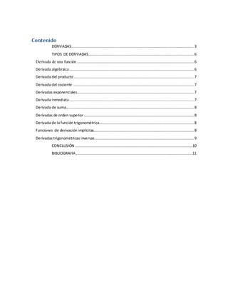 Este documento explica los conceptos básicos de las derivadas, incluyendo sus diferentes tipos como la derivada de una función, derivada algebraica, derivada del producto, derivada del cociente, derivadas exponenciales, derivada inmediata, derivada de suma, derivadas de orden superior, derivada de la función trigonométrica, funciones de derivación implícitas y derivadas trigonométricas inversas. También discute las aplicaciones importantes de las derivadas en física, ingeniería y otras áreas. Finalmente, concluye que las derivadas tienen numeros