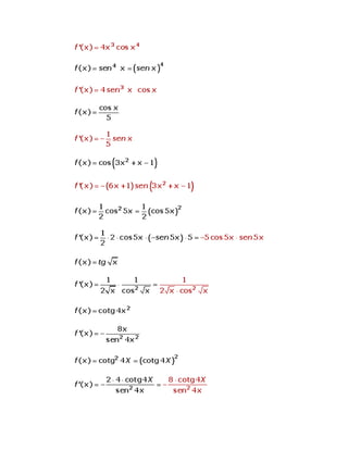 El documento presenta las derivadas de las funciones trigonométricas seno, coseno, tangente, cotangente, secante y cosecante. Luego propone seis actividades para calcular derivadas trigonométricas de funciones dadas como ejercicio de práctica.