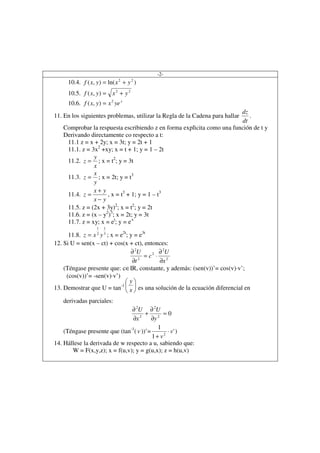 1. El documento presenta una serie de ejercicios de derivadas parciales, incluyendo hallar derivadas parciales de primer y segundo orden, demostrar identidades, y aplicar conceptos como la regla de la cadena y derivación implícita.