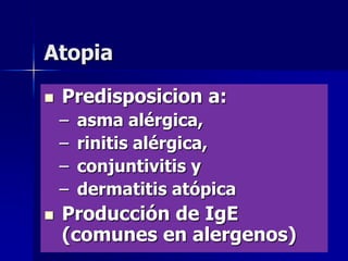 La dermatitis atópica es una afección crónica de la piel que afecta hasta el 20% de la población en países industrializados y es más común en la infancia. Se caracteriza por parches eritematosos, papulosos y pruriginosos que suelen aparecer en mejillas, codos y rodillas. Está asociada a la atopia y la producción elevada de IgE. Su etiología implica una predisposición genética y alteraciones en la inmunidad celular y humoral con predominio de la respuesta TH2. Requi