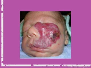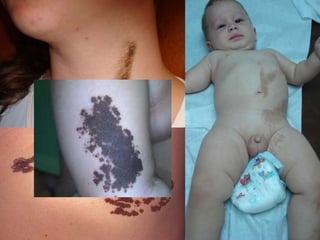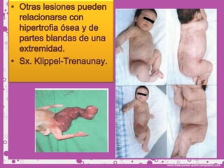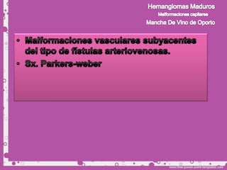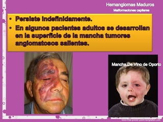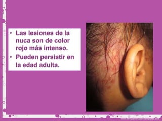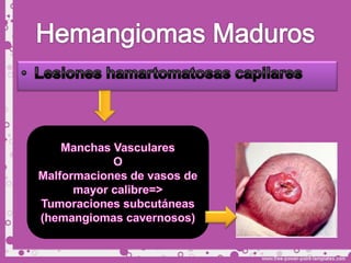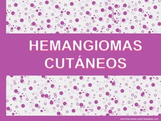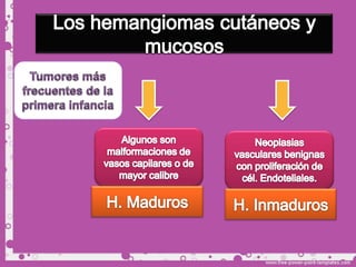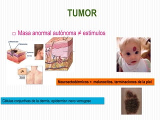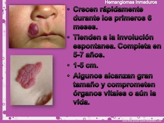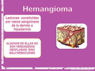Este documento describe diferentes tipos de tumores de la piel, incluyendo tumores benignos como nevos, queratosis seborreica, quistes y hemangiomas. Explica sus características clínicas, histopatología y tratamientos. Los hemangiomas son comunes en lactantes y suelen involucionar espontáneamente, por lo que generalmente no requieren tratamiento.