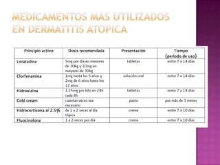 Este documento describe la dermatitis atópica, una enfermedad inflamatoria crónica de la piel. Se caracteriza por lesiones eczematosas con distribución característica e intenso prurito. Tiene un origen multifactorial que incluye factores genéticos y ambientales. Las alteraciones en el sistema inmune, especialmente las relacionadas con las células Th2, los niveles de IgE y las infecciones cutáneas, juegan un papel fundamental en la patogénesis de la enfermedad.